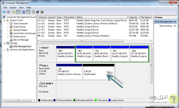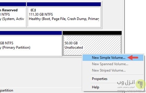Windows Disk management پارتیشن جدید ایجاد کنید