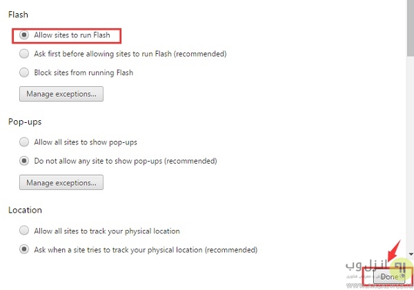 در پنجره تنظیمات عبارت Flash را پیدا کنید. حالا گزینه Allow sites to run Flash را انتخاب کنید. بعد روی Done کلیک کنید تا تغییرات اعمال شود.