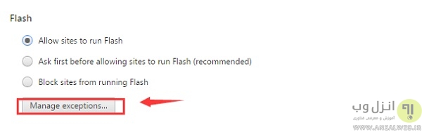 اگر شما می خواهید به سایت های بیشتری اجازه اجرای فلش پلیر را بدهید، روی دکمه Manage exceptions کلیک کنید.