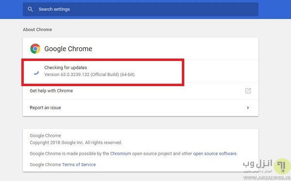 یک سربرگ جدید باز خواهد شد، در این صفحه آخرین نسخه گوگل کروم چک می شود. در صورت وجود آپدیت گوگل کروم روی آن کلیک کنید و نصب کنید. بعد از آپدیت گوگل کروم مرحله قبل را برای فعال کردن فلش پلیر دنبال کنید.