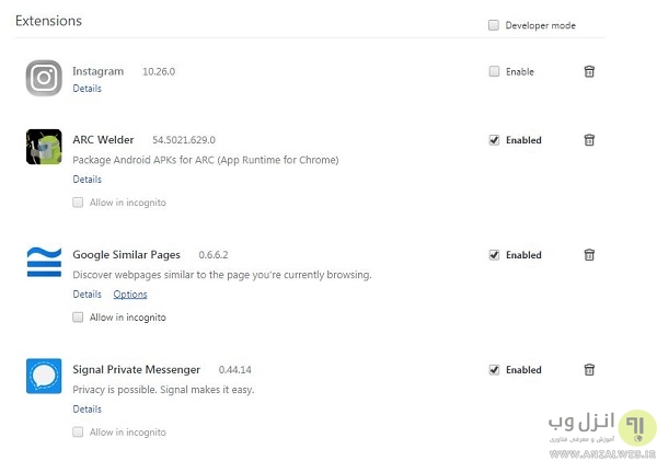 گاهی اوقات برخی افزونه ها باعث غیر فعال شدن فلش پلیر و Shockwave در مرورگر شما می شوند. برای حل این مشکل عبارت(about:extensions) را در نوار آدرس گوگل کروم تایپ کنید و اینتر کنید. حالا لیستی از افزونه هایی که نصب کردید به شما نمایش داده می شود. همه آنها را از حالت انتخاب خارج کنید. بعد ببینید مشکلتان حل شده یا خیر.