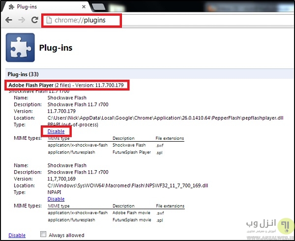 توجه داشته باشید که اگر شما دو نسخه متفاوت از فلش پلیر را نصب داشته باشید ممکن است با مشکل اجرا نشدن فلش پلیر در کروم مواجه شوید. برای حل این مشکل در نوار آدرس گوگل کروم عبارت chrome://plugins را تایپ کنید. روی لینک Details کلیک کنید. دو فایل .dll به شما نمایش داده می شود که هر کدام حاوی مقداری از اطلاعات هستند. در قسمت Location شما می توانید موقعیت فایل های dll را مشاهده کنید. در زیر این موقعیت شما یک لینک آبی رنگ با عنوان Disable مشاهده خواهید کرد. روی یکی از آنها کلیک کنید تا یکی از نسخه های فلش پلیر برایتان غیر فعال شود.